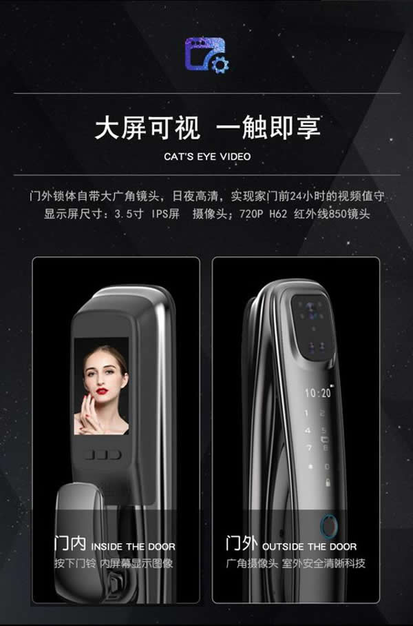 1.祥云系列的智能鎖搭載了高清的攝像和顯示屏幕,使用者在家里就可以將外面的一切看的一清二楚。想要從外面打開(kāi)房門的話,不需要再去掏鑰匙,只需要把自己的面部對(duì)著攝像頭掃描,智能系統(tǒng)會(huì)自動(dòng)分辨面部特征,并且和自己系統(tǒng)中的面部識(shí)別庫(kù)匹配,開(kāi)鎖只需要一秒鐘。