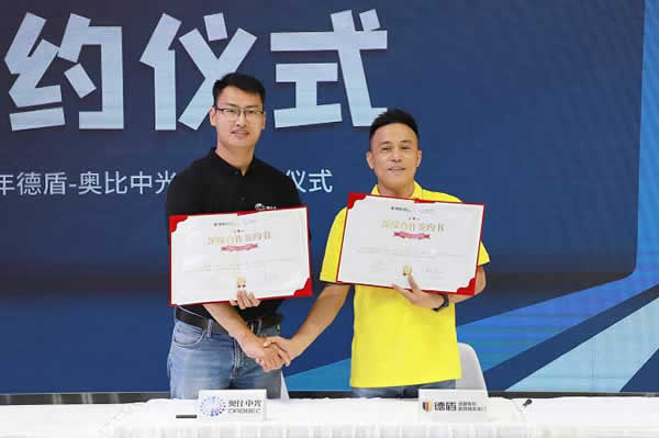 圖注:奧比中光與德盾現(xiàn)場簽約,左為奧比中光安防產(chǎn)品線副總經(jīng)理李然春